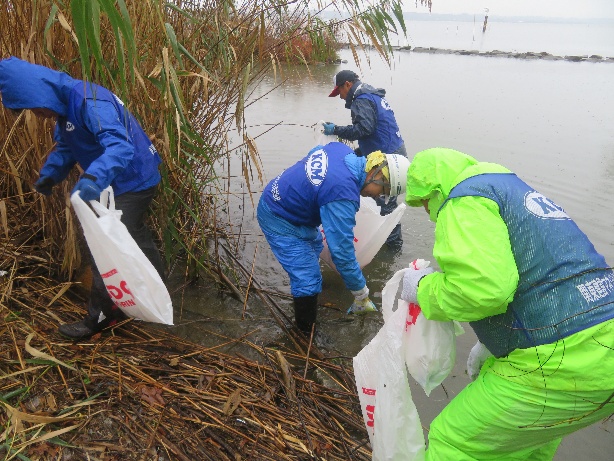 千葉支店で新調したオリジナルKCMビブスを着用し、湖岸に漂着したゴミや不法投棄された大型ゴミの回収に取り組みました。