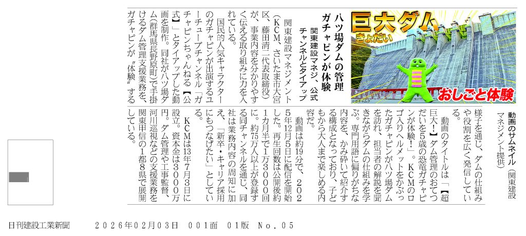 令和8年2月3日発行の日刊建設工業新聞において、当社とYouTubeチャンネル「ガチャピンちゃんねる【公式】」とのタイアップに関する記事が掲載されました。