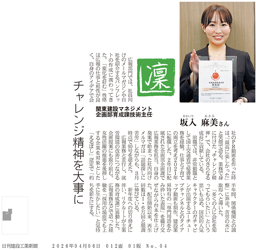 令和8年4月6日発行の建設工業新聞のコーナー「凜」において、当社社員が紹介されました。